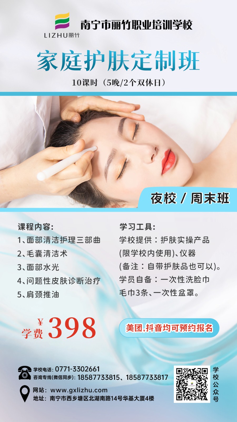 廣西美容短期班(夜班/周末班):家庭護(hù)膚定制班