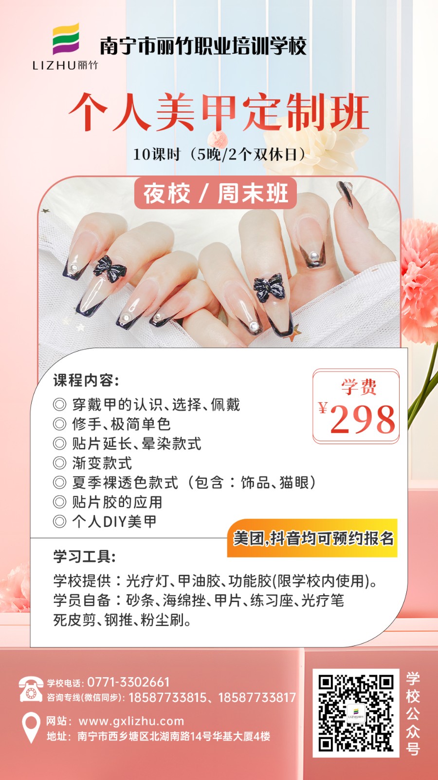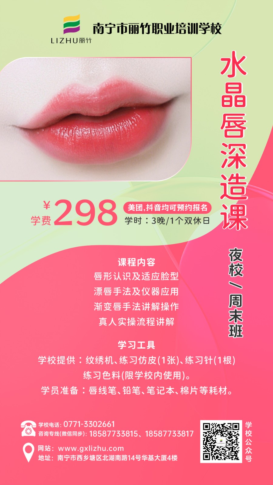 廣西彩妝造型學(xué)校、廣西美甲培訓(xùn)、廣西美容短期班、廣西培訓(xùn)紋唇、廣西紋繡眉眼唇學(xué)習(xí)分享:麗竹學(xué)校特色課程(夜校/周末班)熱門(mén)火爆技能課程重磅來(lái)襲啦!課程涵蓋化妝,美甲,美容,紋繡等技能,感興趣的小伙伴趕緊關(guān)注麗竹學(xué)校了解更多課程詳情和現(xiàn)在正在進(jìn)行的優(yōu)惠活動(dòng)詳情。