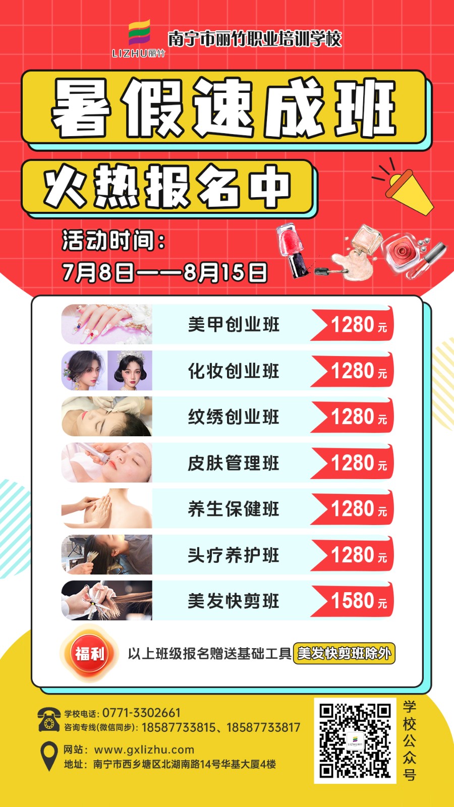 漫長(zhǎng)暑假不想虛度光陰?不想在酷暑之下去各大景區(qū)人擠人?那不如在開學(xué)之前學(xué)習(xí)一些變美的小技巧,讓自己以全新的形象去迎接新的校園生活吧!如果你想在廣西學(xué)美容美發(fā),想知道廣西化妝美甲學(xué)費(fèi)多少?想知道廣西紋繡去哪學(xué)……那就千萬不要錯(cuò)過廣西美容美發(fā)化妝美甲(麗竹學(xué)校)暑假速成班推出的課程報(bào)名活動(dòng)啦!